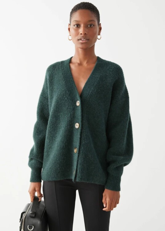 Яскраві кардигани, виконані з м’якої та пухнастої пряжі яскравих відтінків з пишними рукавами і гудзиками незвичайної форми ідеально підійдуть для святкових зимових образів.