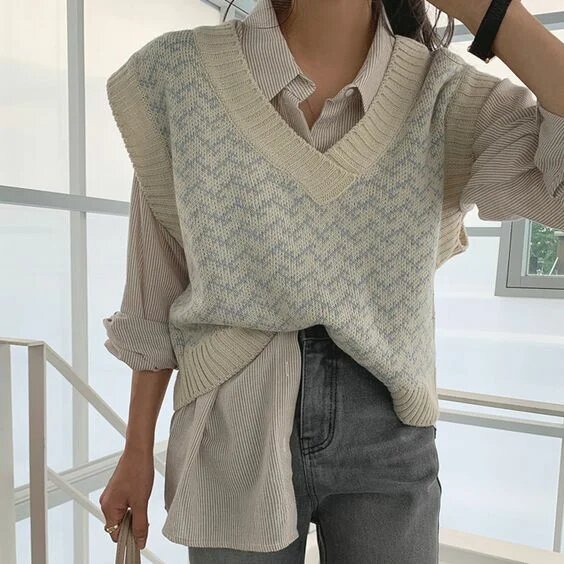 Наступними трендом зимового сезону є в’язаний жилет в актуальним геометричним принтом. Стильну і теплу річ стилісти пропонують нам носити в одному тандемі з базовими світлими сорочками легкого оверсайз розміру.
