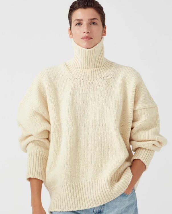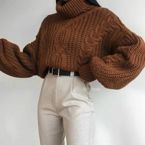 Оверсайз в’язані светри з високою горловиною – теплий і затишний тренд сезону зима 2020/2021. Об’ємні рукави роблять жіночу фігуру пропорційною і більш елегантною.
