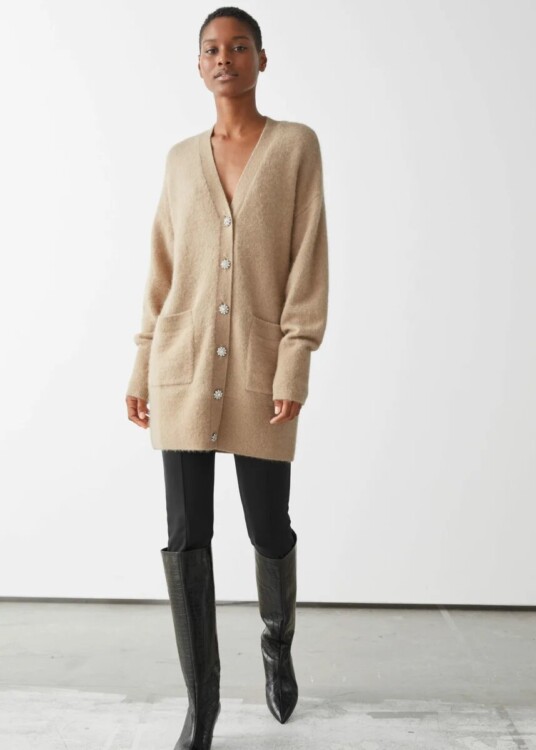 Стилісти рекомендують сучасним модницям урізноманітнити свій зимовий базовий гардероб подовженим кардиганом бежевого відтінку.
