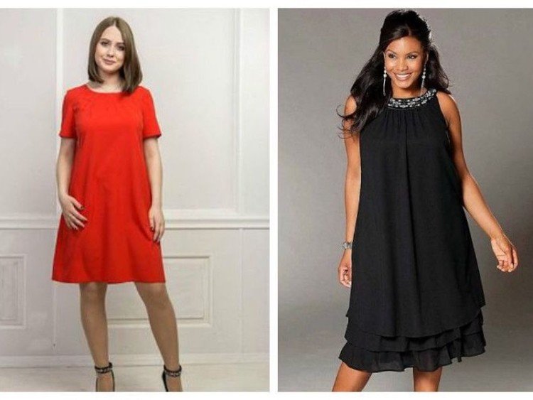 Такий одяг краще сукні-футляр. Сукня А-силуету не обтягує, демонструючи кожну складку тіла. Класичні фасони в принципі добре підходять, щоб зменшити на пару розмірів. Відмінно витягне фігуру розкльошена спідниця нижче коліна, на відміну від спідниці-олівець, що не рятує від прояву «вушок».