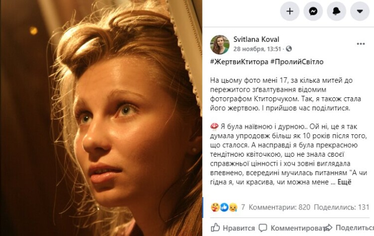 Своєю історією в Facebook поділилася дівчина на ім’я Світлана Коваль, яка піддалася насильству з боку Ктиторчука, коли їй було 17 років.