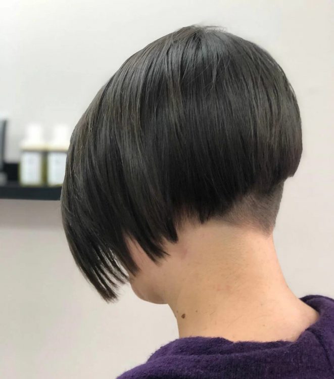 Боб з короткою потилицею і подовженою маківкою – варіант для жінок, які люблять об’єм на своєму волоссі. Створювати ультрамодні «кудлаті» укладання з даною довжиною волосся не важко навіть у домашніх умовах.