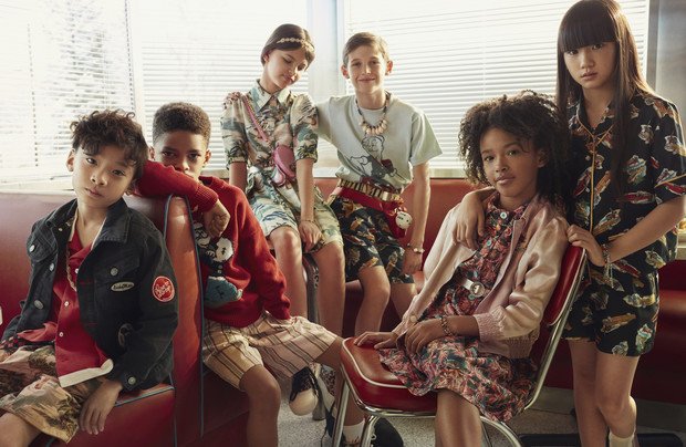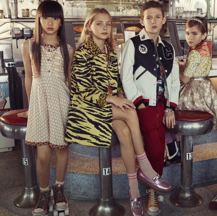 Для дівчаток – сукні-сорочки з тропічним принтом і туфлі Мері Джейн з золотим блиском; джинсова куртка із зображенням героїв з коміксів і трикотажні вироби з монограмою.