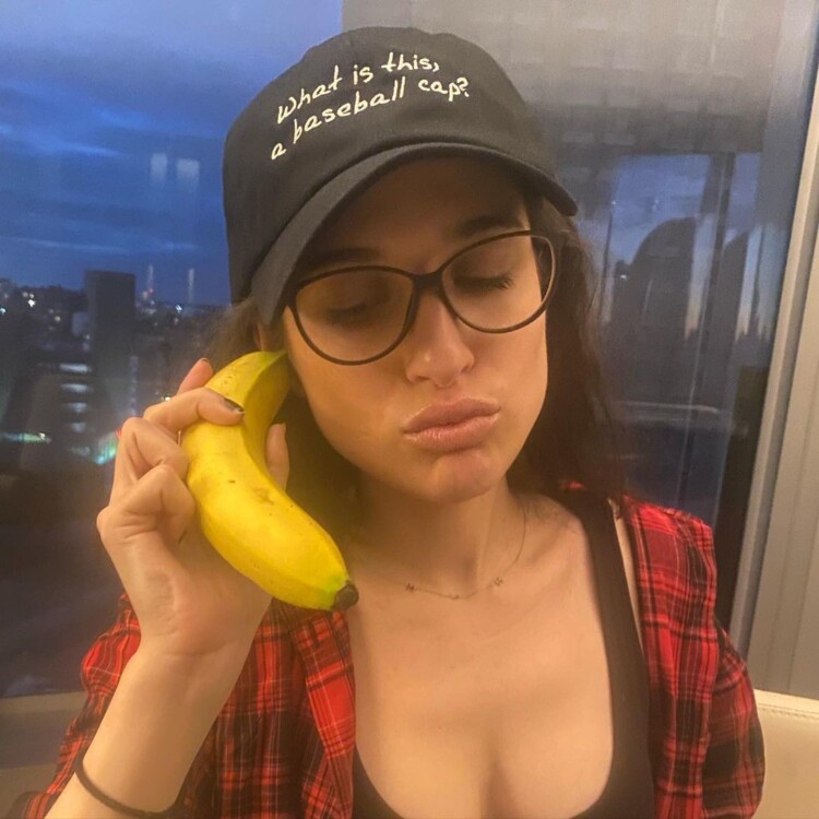 На другому кадрі дівчина позує в бейсболці з аналогічним написом.