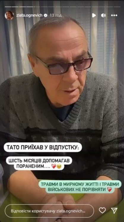 За словами співачки, вона не бачила його півроку. В Instagram-stories Злата Огнєвіч показала рідну людину. За словами зірки, її батько військовий хірург. Протягом шести місяців він рятував життя сотні українських захисників.