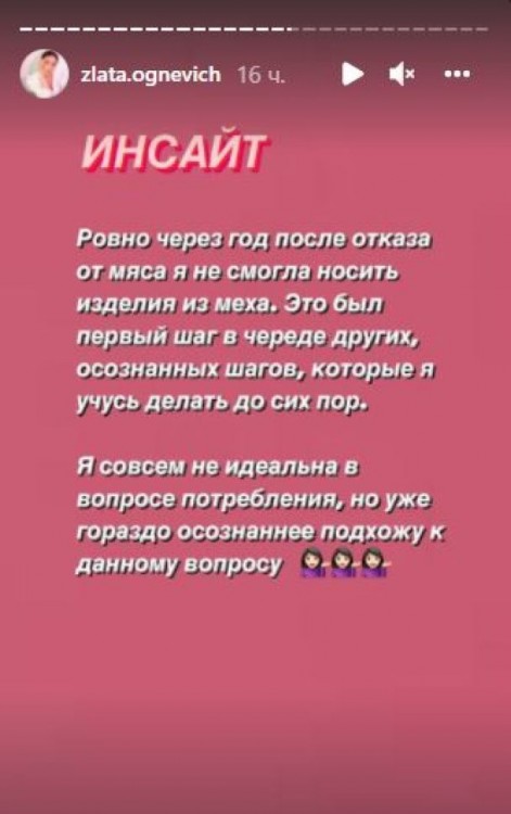 За словами артистки, м’яса вона не їсть вже вісім років. Злата Огнєвіч зізналась, що в якийсь момент зрозуміла, що цей інгредієнт не приносить їй користі.