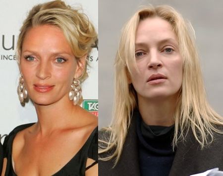 Одна з найяскравіших зірок Голлівуду, неповторна Ума Турман, чию фільмографію без коливань можна назвати шедевральною, завжди постає перед публікою в ідеальному образі. Променисто-блакитні очі підкреслює акуратний макіяж, волосся прибране у витончену зачіску, доповнюють образ вишукані прикраси. І все ж, випадково зустрівши зірку екрану на вулиці в такому вигляді, як на фото праворуч, не кожен з нас впізнав би в цій жінці карколомну Уму Турман.