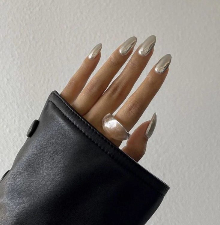 У 2023 році в моду знову повертається металік, причому не тільки в одязі та аксесуарах, а й, звичайно, на нігтях. Хромове покриття не обов’язково може сліпити своїм металевим блиском, його також можна використовувати поверх непрозорих та прозорих базових відтінків, що надасть нігтям глянсового здорового вигляду.